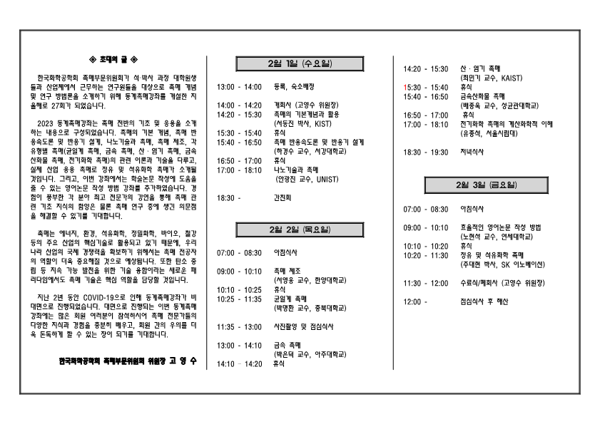[촉매부문위원회] 2023년도 동계 촉매 강좌 안내