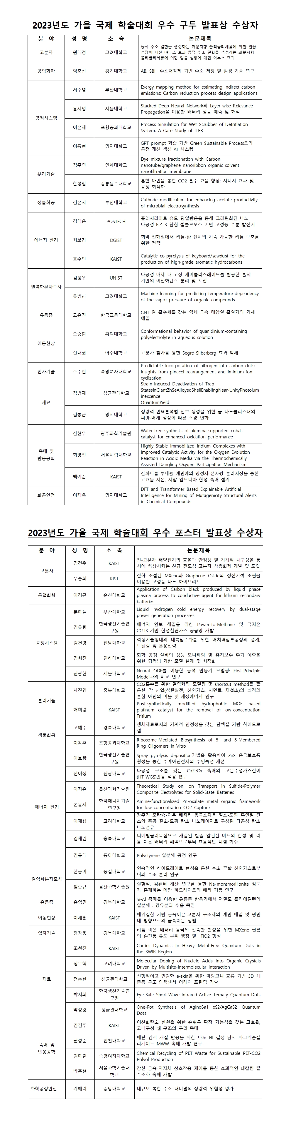 2023년도 가을 총회 및 학술대회 우수 구두/포스터 발표상 수상자 명단