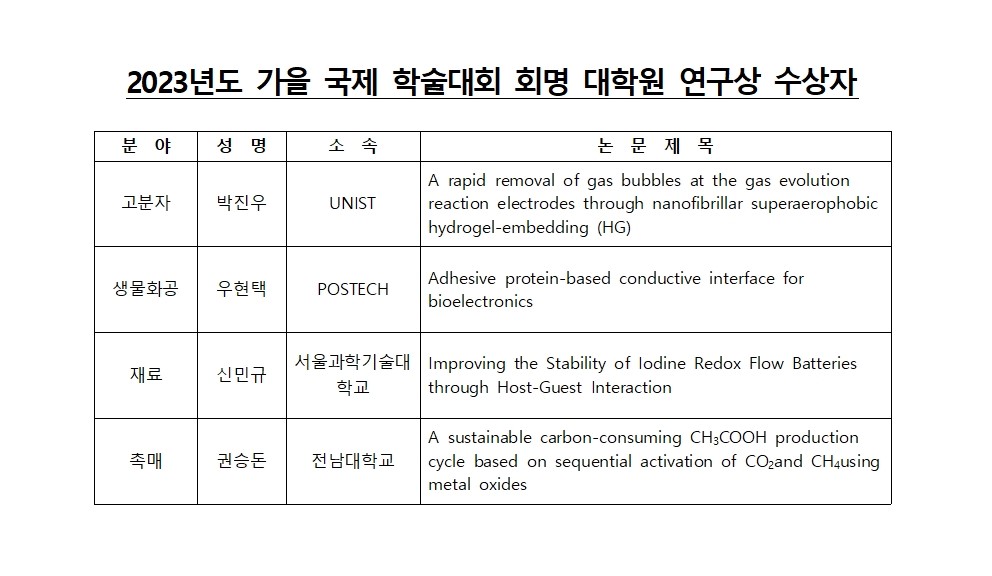 2023년도 가을 총회 및 학술대회 회명 대학원 연구상 수상자 안내
