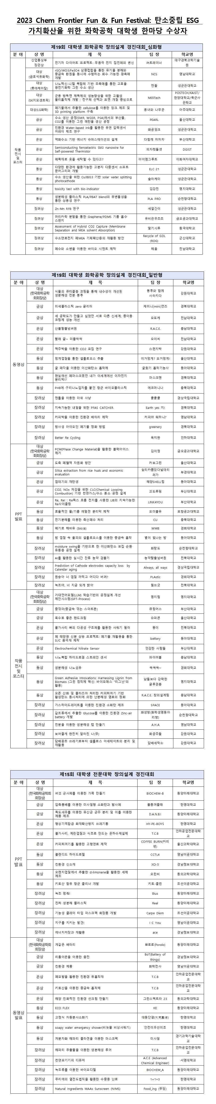 2023 Chem Frontier Fun & Fun Festival: 탄소중립 ESG 가치확산을 위한 화학공학 대학생 한마당 수상자 명단 안내