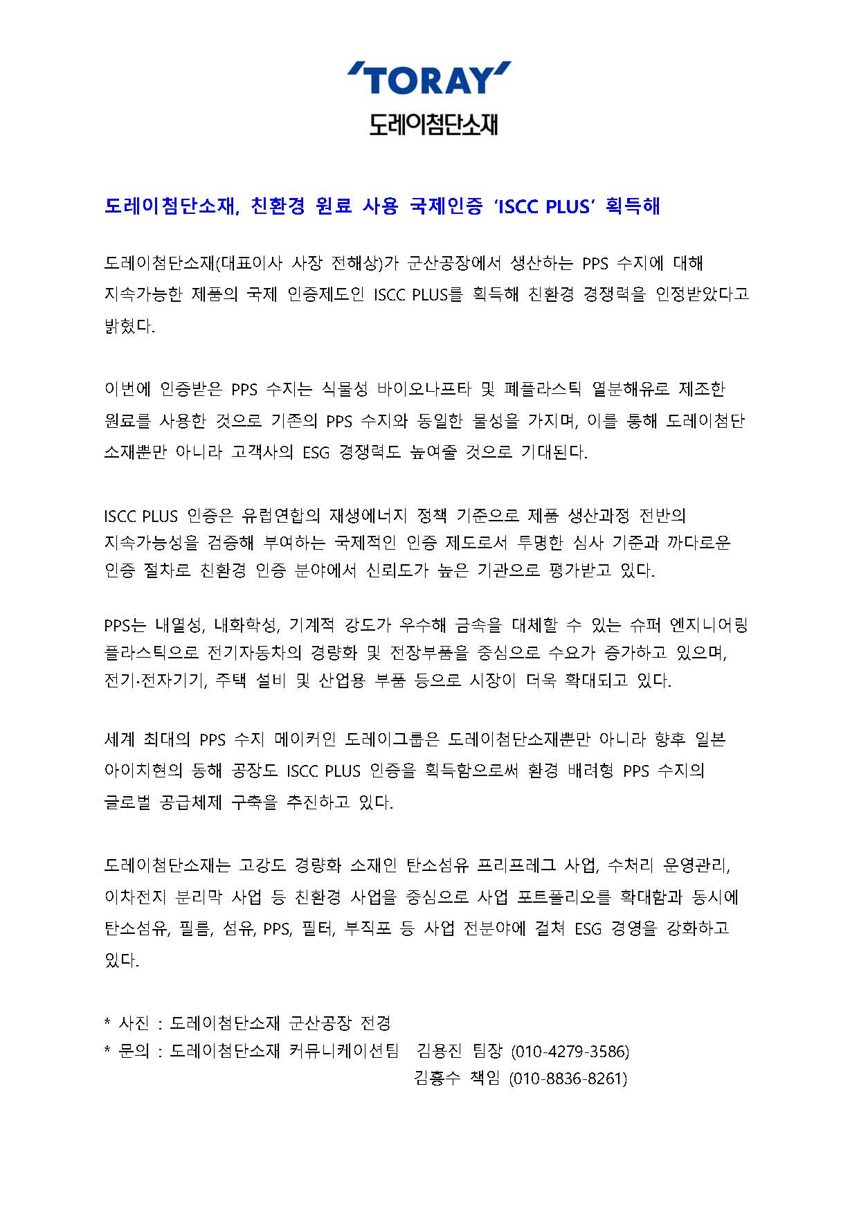 [도레이첨단소재] 친환경 원료 사용 국제인증 ‘ISCC PLUS’ 취득