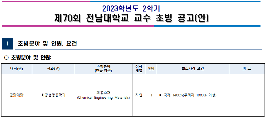 [전남대학교] 2023학년도 2학기 화공생명공학과 교수초빙 (공개채용)