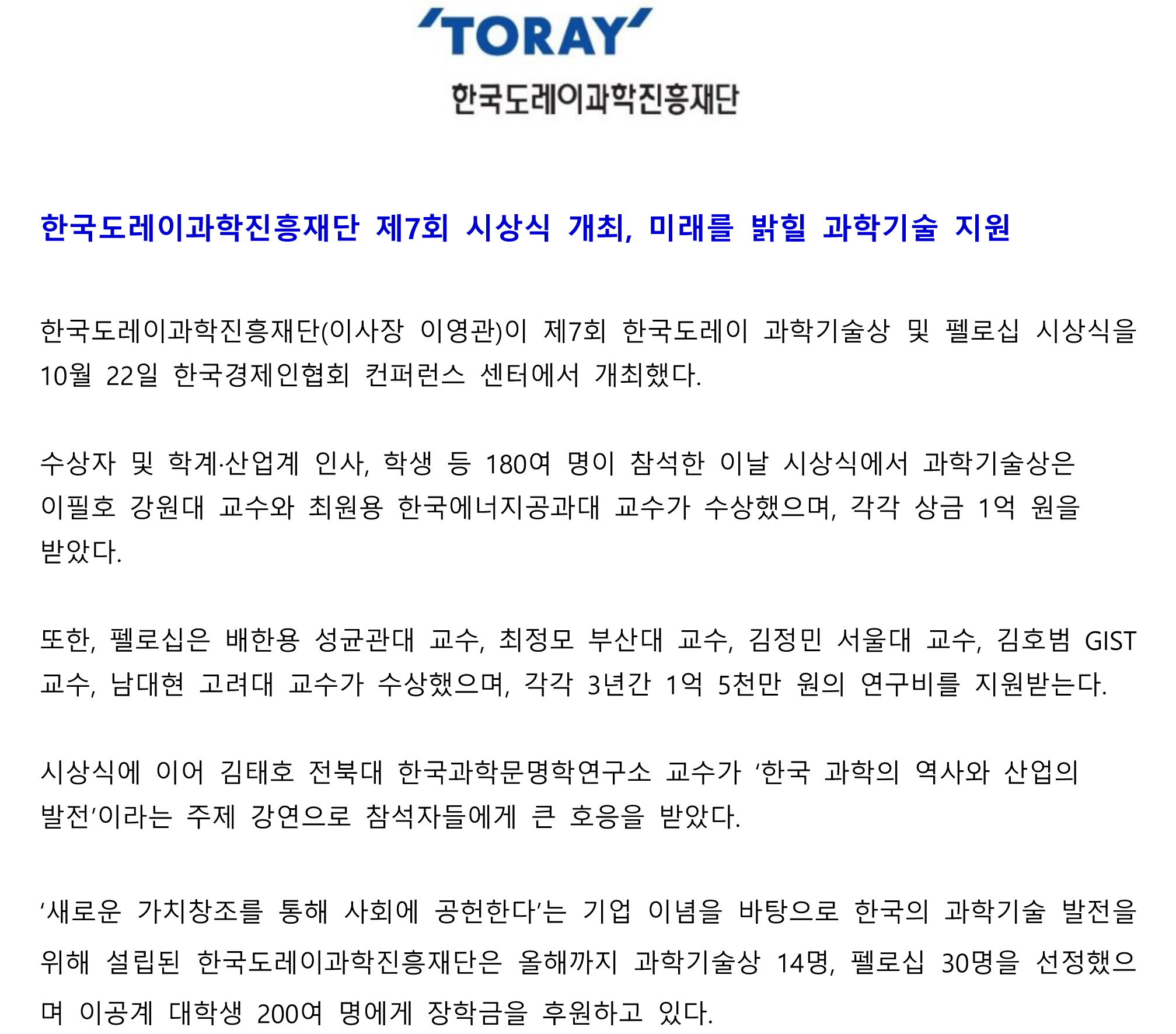 [한국도레이과학진흥재단] 제7회 시상식 개최
