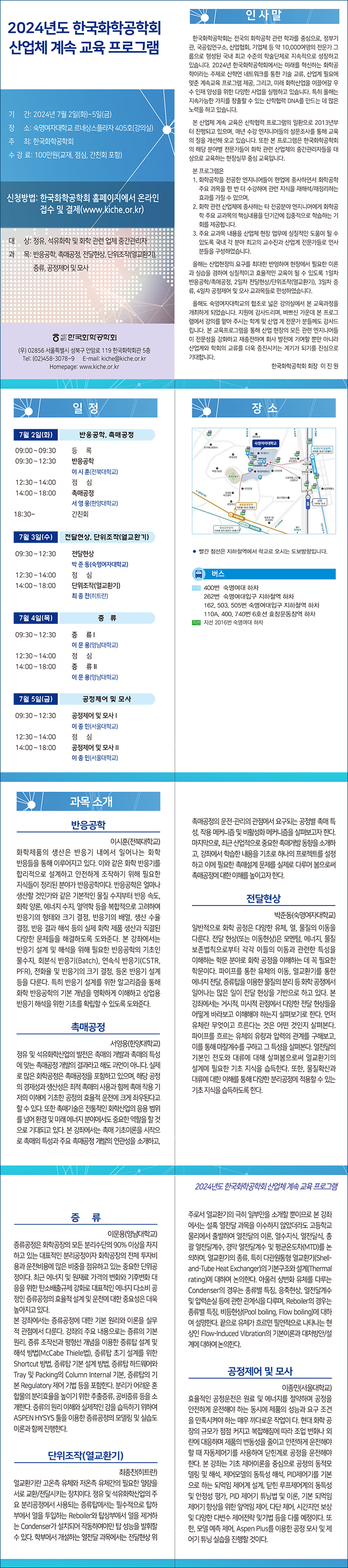 일 시 : 2024년 7월 2일(화)~5일(금) 장 소 : 숙명여자대학교 주 최 : 한국화학공학회 수 강 료 : 100만원(교재, 점심, 간친회 등 포함)